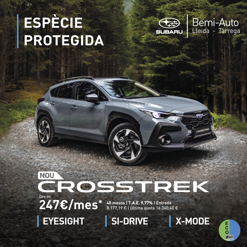 *Finançament de Subaru Crosstrek 2.0i Active. Preu al comptat 32.500,00 €. Preu finançant 30.000,00 €. Entrada 8.177,19 €. Termini 48 mesos, 1 quota de 233,78 €, 46 quotes de 247,00 € i 1 quota de 16.340,40 € (màxim 40.000 km). Tipus Deutor 7,99% T.A.E. 9,77% (La T.A.E., així com la primera quota podrà variar lleugerament en funció del dia de la signatura del contracte i de la data de pagament de les quotes). Comissió d'Obertura 3,95% 862,00 € Comptat. Interessos 6.113,37 €, Import Total del Crèdit 21.822,81 €, Cost Total del Crèdit 6.975,37 €, Import Total Degut 28.798,18 €, Preu Total a Terminis 36.975,37 €. Sent el dia de contractació 09/10/2025 i primer pagament el 02/11/2025. Oferta vàlida fins al 30/11/2025. Sistema d'amortització Francés. Finançament ofert, subjecta a estudi i aprovació per part de Santander Consumer Finance, S.A